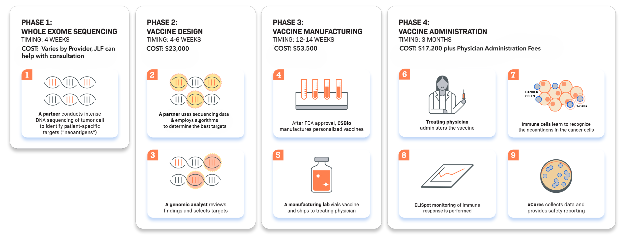The JLF process involves industry leaders providing cutting-edge technology at every step. JLF consults and contracts with the patient to discuss costs, holds IND and trial liability insurance, and guides the entire process. Our partners manage vaccine design, vaccine manufacturing, and patient protocol startup and consent with the treating physician. Developing a personalized therapeutic vaccine takes 4-5 months.